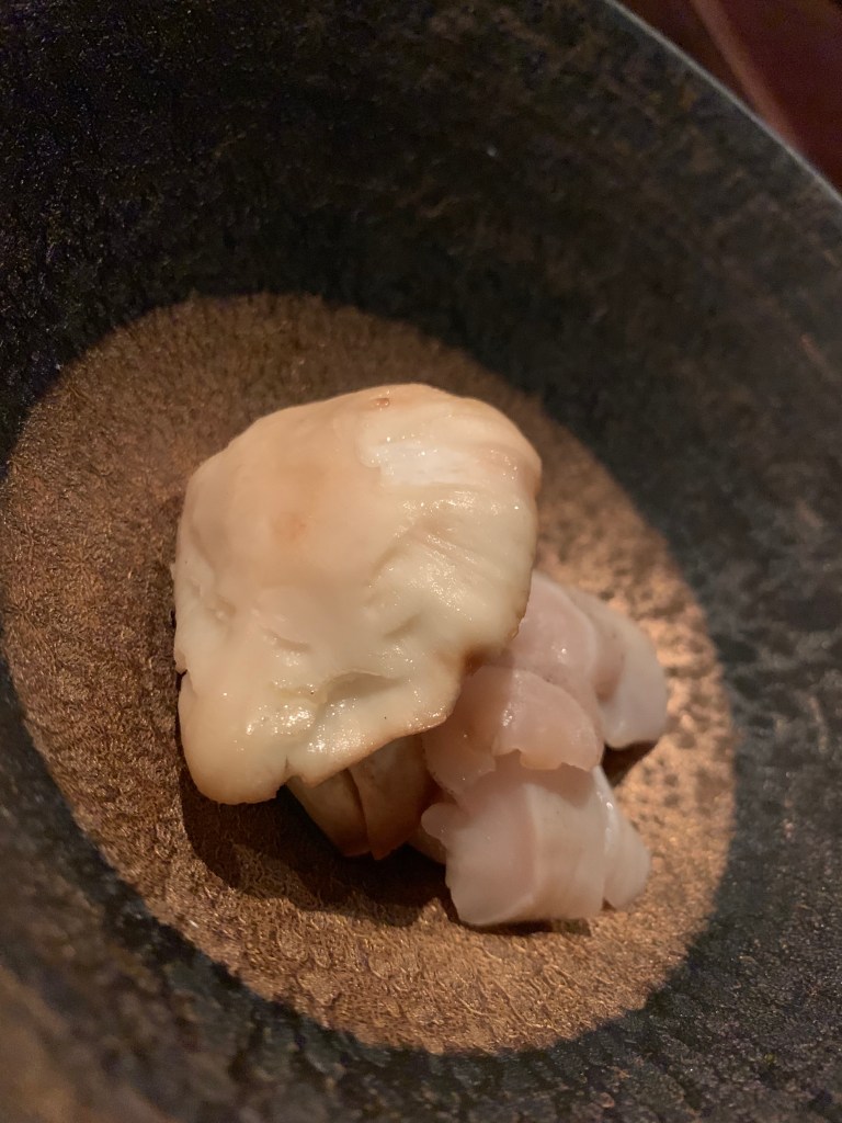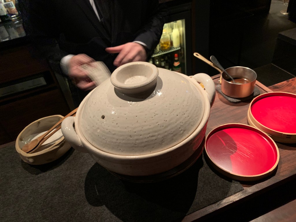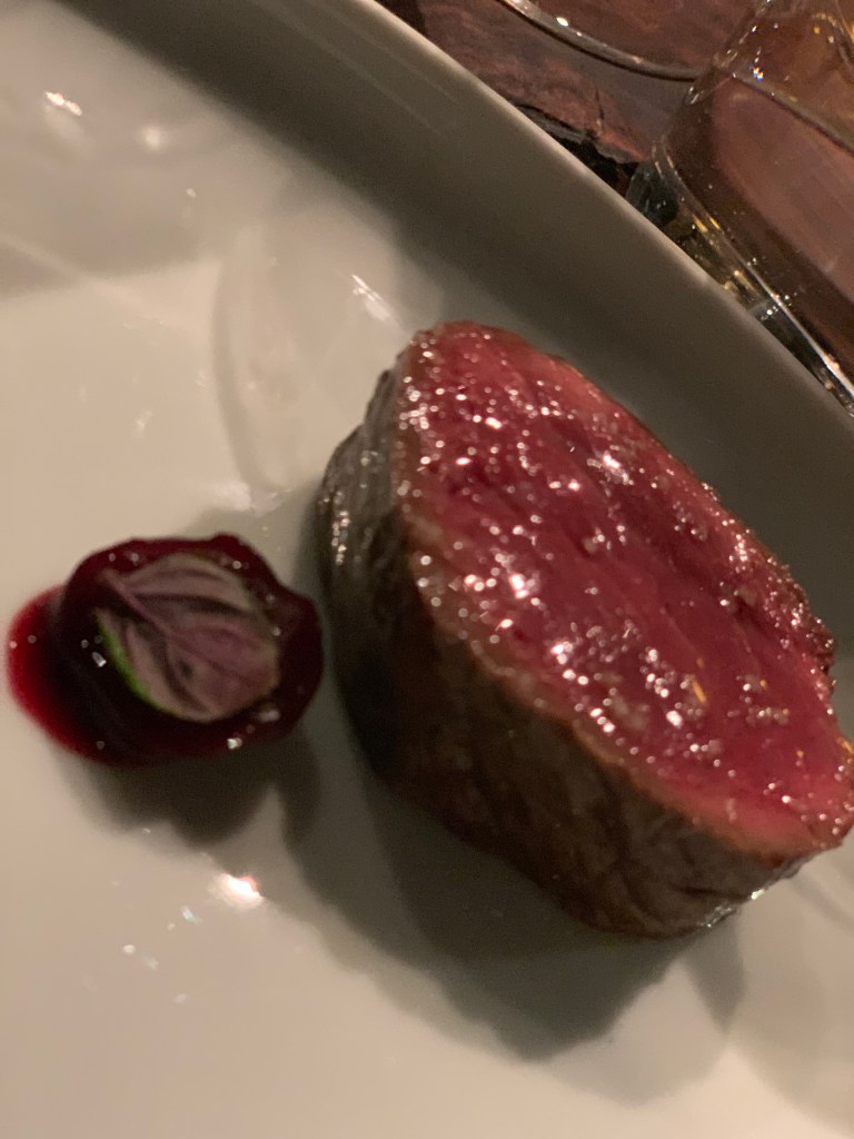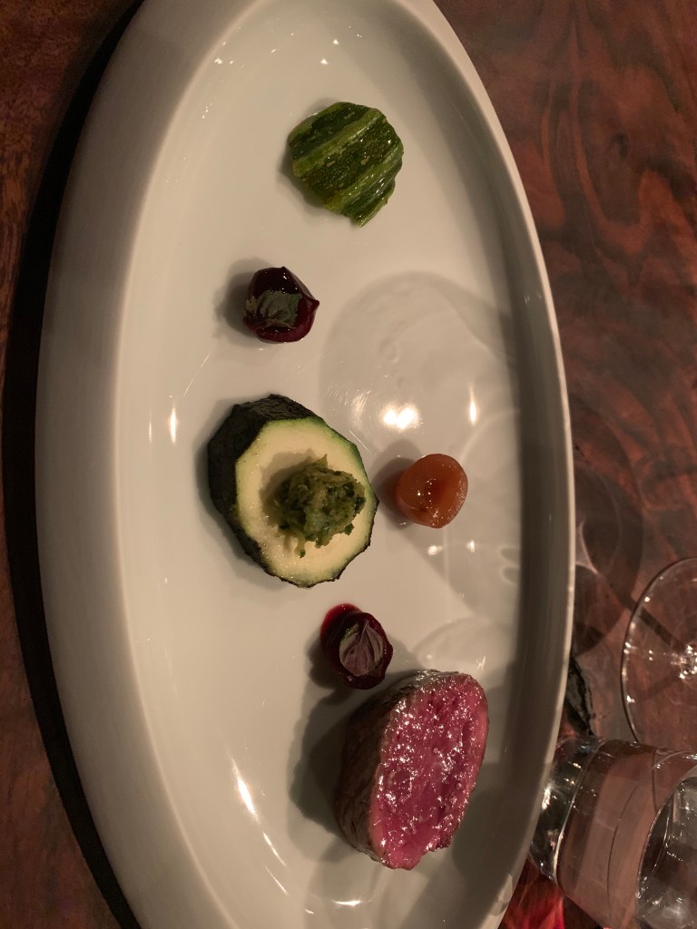 Transitioning away from seafood and serving as the centerpiece of the card was a presentation of Bison served in the donburi style. Notable flourishes such as custom knives and artisanal salts contributed to an amazing focal point for the evening. A savory, smoky filet with indredible balance and perfectly cooked, draped in a velvety sauce redolent of berries and Cabernet – a wonderful accompaniment to the slightly gamey flavors of the protein.