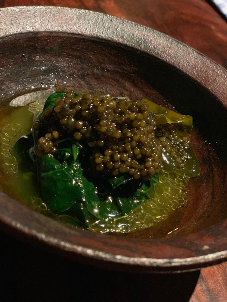The card itself is a surprise as the menu is not offered to you in advance, which only serves to heighten the anticipation. My meal began with a bespoke tea, segued to various presentations of crudo and really began to ascend with a simply sublime presentation of caviar, kissed by smoke from the requisite wood stove. Each course was perfectly plated and offered with warmth and a depth of knowledge that is surprisingly missing from many similar dining experiences in town.